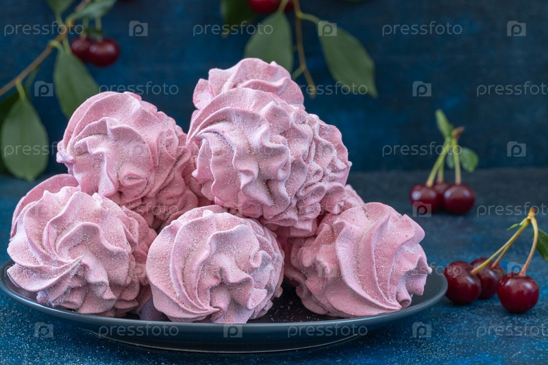 Вишневый розовый зефирный летний десерт на синем фоне