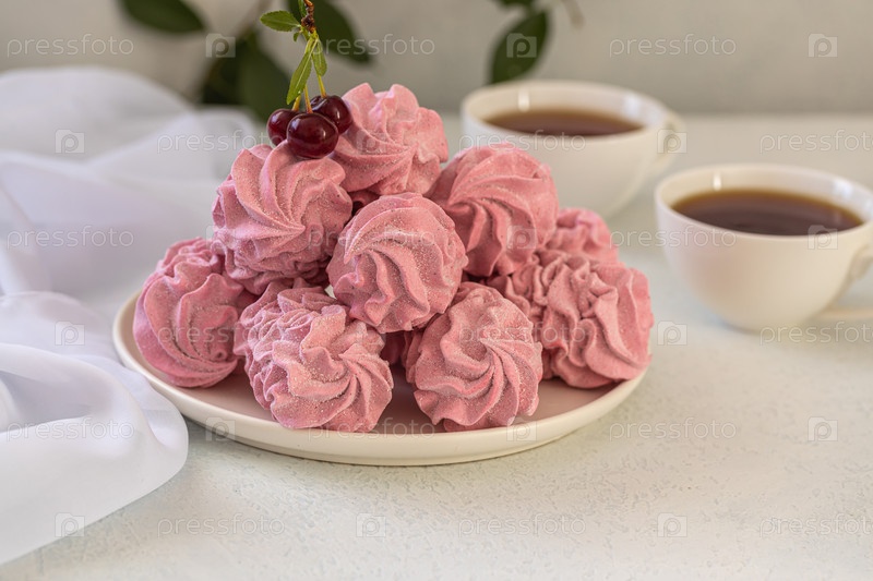 Вишневый розовый зефирный летний десерт на светлом фоне