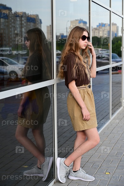 Девочка-подросток в солнечных очках смотрит на отражение в стекле