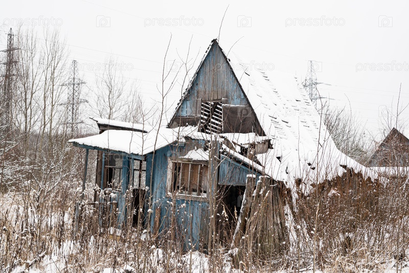 Старый заброшенный и полуразрушенный деревянный загородный дом в зимний сезон