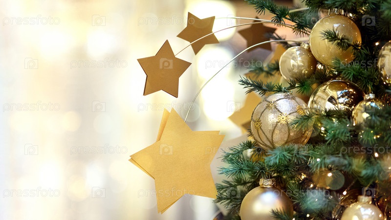 Поздравительная открытка с рождественской елкой, украшенной золотыми шарами и безделушками звезд