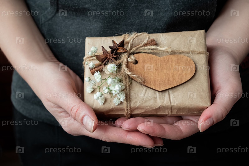 Подарочная коробка, завернутая в крафт-бумагу, украшенная деревянным сердцем и белыми цветами в руках человека. Празднование дня святого Валентина