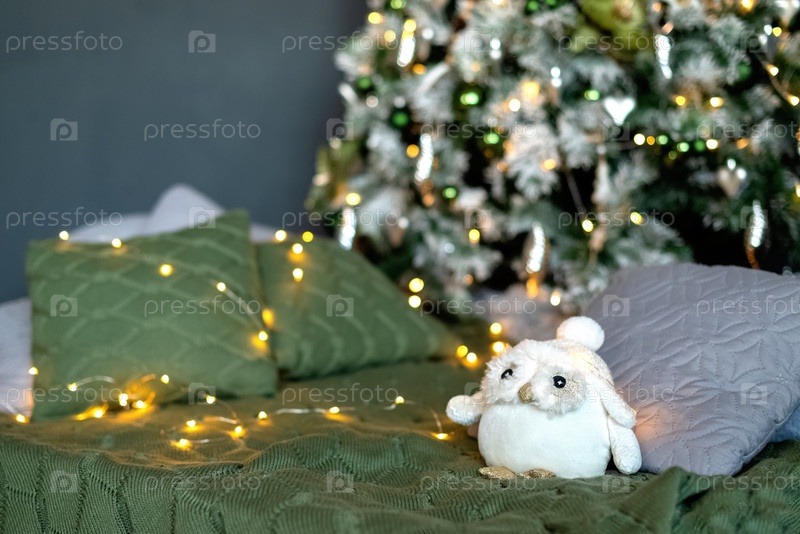 Праздничный домашний интерьер с декоративными подушками, разбросанными по полу под богато украшенной рождественской елкой, зажженной гирляндой и милой игрушкой на диване