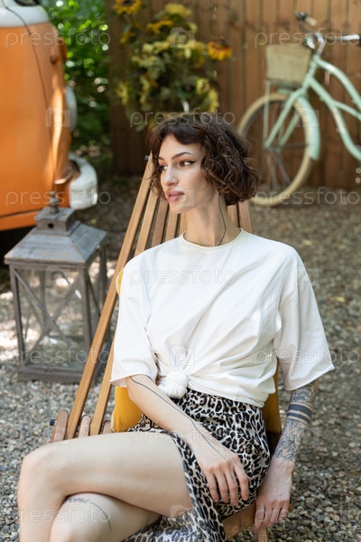 Молодая красивая женщина позирует на улице, сидя в кресле летом
