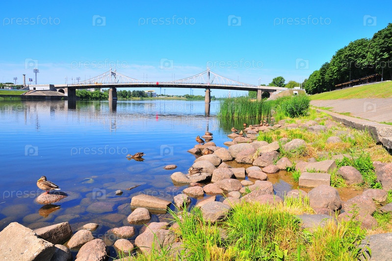Берег реки Волга в городе Тверь в Заволжском парке с видом на мост через реку