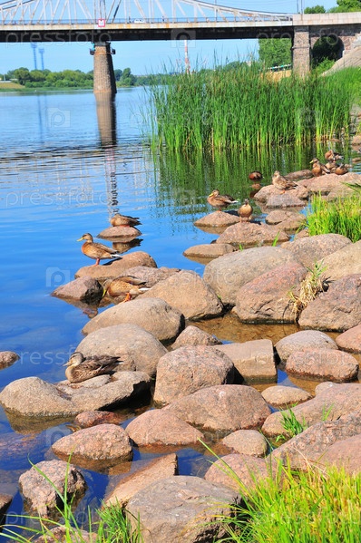 Утки на берегу Заволжского парка города Тверь около старого волжского моста