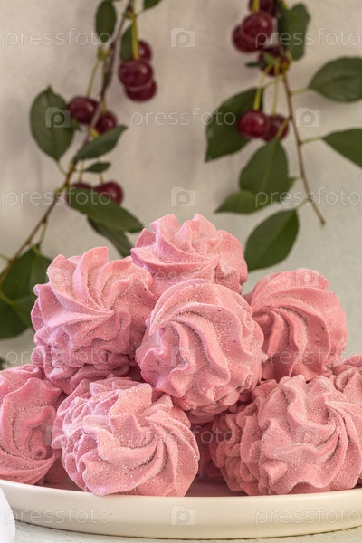 Вишневый розовый зефирный летний десерт на светлом фоне