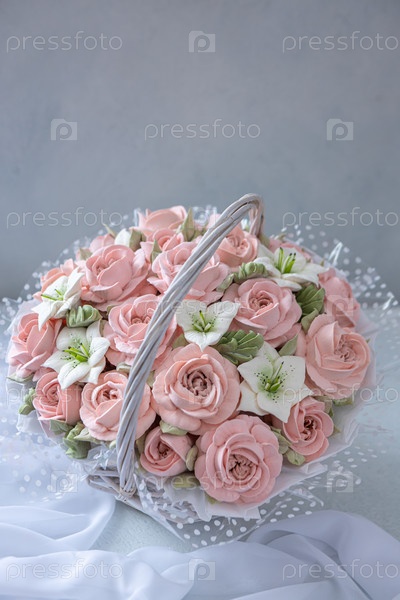 Зефирный букет цветов в плетеной корзине на светлом фоне