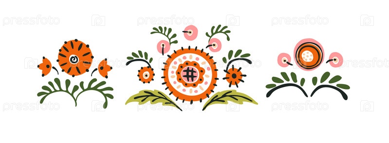 Набор этнических элементов. Бордюр представляет собой полосу с цветами, листьями, ветками, вензелями. Народная вышивка. Славянский, украинский, русский мотив. Хохлома, матрешка, дымковская игрушка. Мексиканский, индийский, цыганский ковер. Вязаное кружево