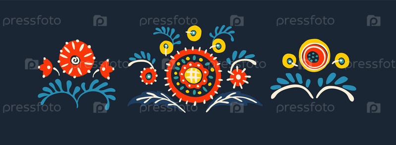 Набор этнических элементов. Бордюр представляет собой полосу с цветами, листьями, ветками, вензелями. Народная вышивка. Славянский, украинский, русский мотив. Хохлома, матрешка, дымковская игрушка. Мексиканский, индийский, цыганский ковер. Вязаное кружево