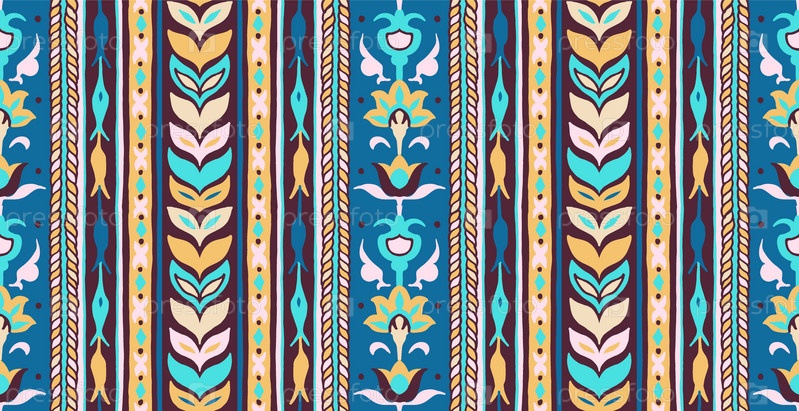 Геометрический дамасский орнамент. Икат границы. Этническая вышивка с листьями и монограммами. Племенная векторная текстура. Бесшовный народный узор в ацтекском стиле. Индийский, скандинавский, цыганский, мексиканский, африканский ковер