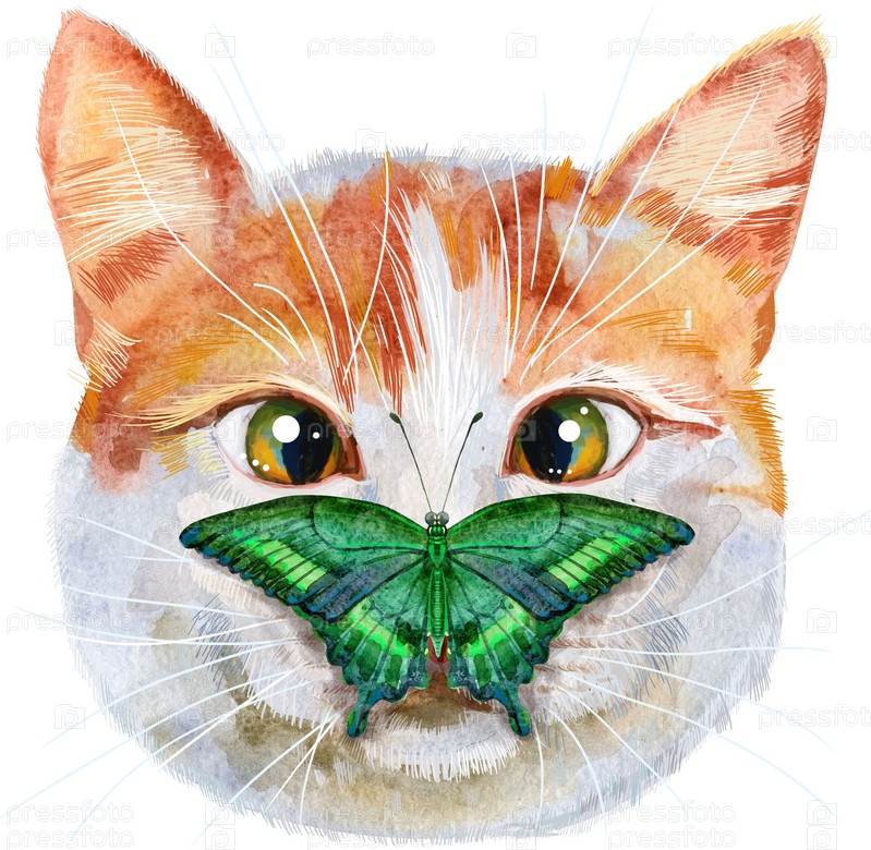 Симпатичный кот с бабочкой. Кот для графики на футболках. Акварельная иллюстрация породы турецкий ван