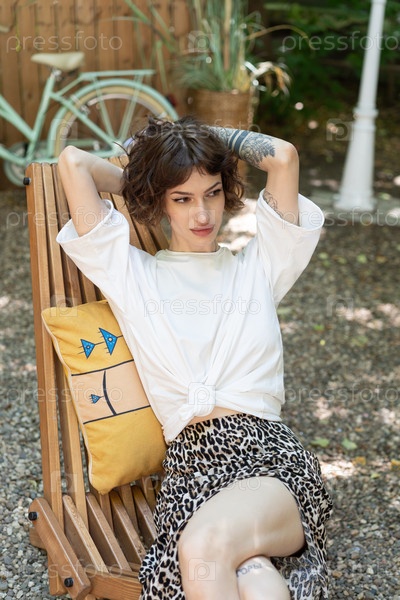 Молодая красивая женщина позирует на улице, сидя в кресле летом