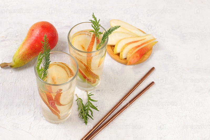 Концепция диеты и потери веса. Грушевый сидр, сок или фруктовый напиток и ингредиенты на солнечном столе. Груши способствуют очищению организма и снижению веса. Здоровое питание, детоксикация организма, селективный фокус