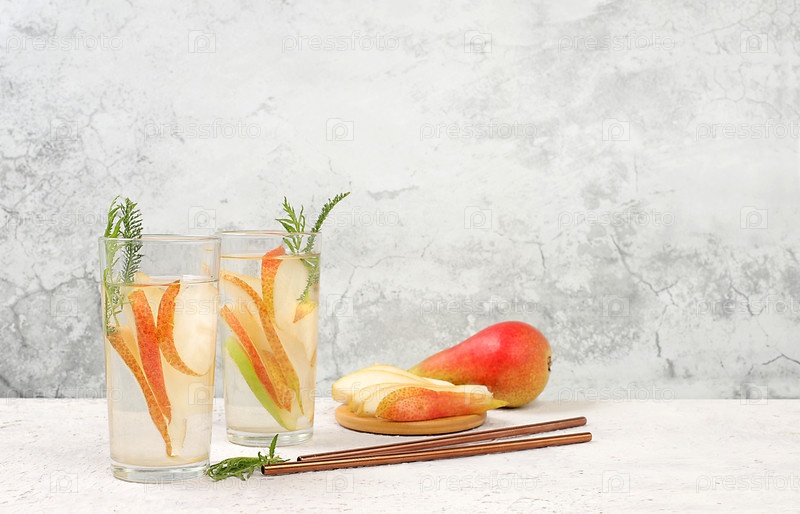 Детокс фруктовая ароматизированная вода с грушей и мятой на светлом фоне. Освежающий летний домашний лимонадный коктейль. Фруктовый сок и ингредиенты, концепция потери веса, здоровая и натуральная пища, селективный фокус
