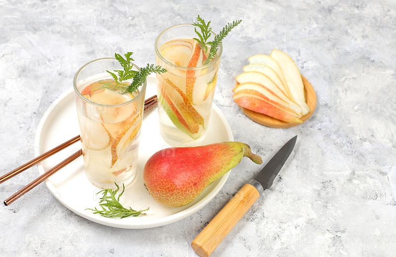 Детокс фруктовая ароматизированная вода с грушей и мятой на светлом фоне. Освежающий летний домашний лимонадный коктейль. Фруктовый сок и ингредиенты, концепция потери веса, здоровая и натуральная пища, селективный фокус