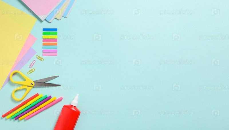 Предметы для студента или офиса. Вернуться к школьной концепции. Ножницы, цветная бумага, карандаши на синем фоне. Вид сверху, пустое рекламное место справа
