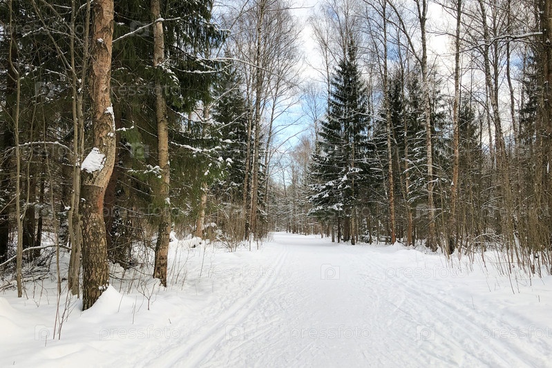 Ландшафт зимнего леса с заснеженными деревьями и лыжными трассами на заснеженной дороге
