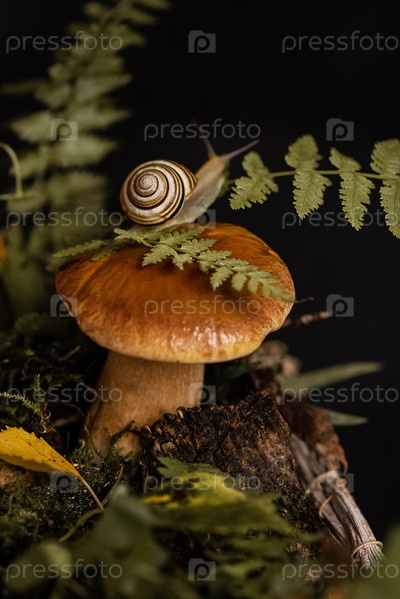 Милая улитка с полосатой раковиной ползает вокруг большого гриба подосиновика, растущего сквозь мох и опавшие листья в лесу