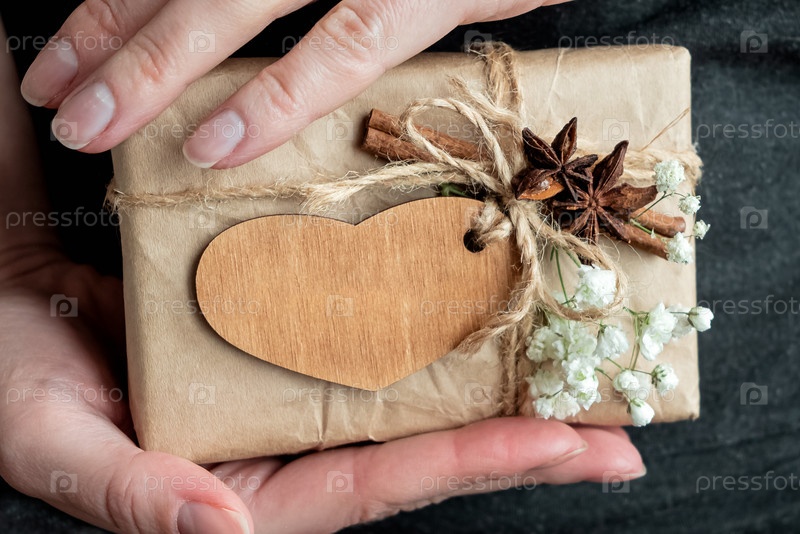 Подарочная коробка, завернутая в крафт-бумагу, украшенная деревянным сердцем и белыми цветами в руках человека. Празднование дня святого Валентина