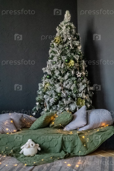 Праздничный интерьер с декоративными подушками, разбросанными по полу под богато украшенной елкой