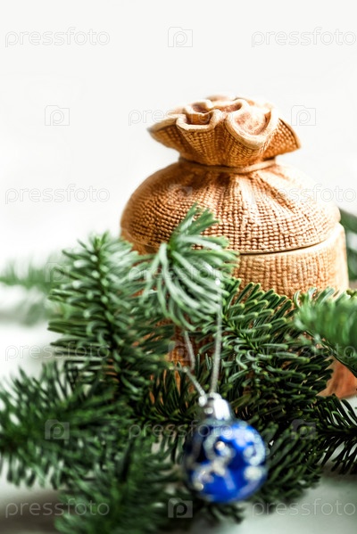 Рождественская композиция из еловых веток с холщовым мешком с подарками