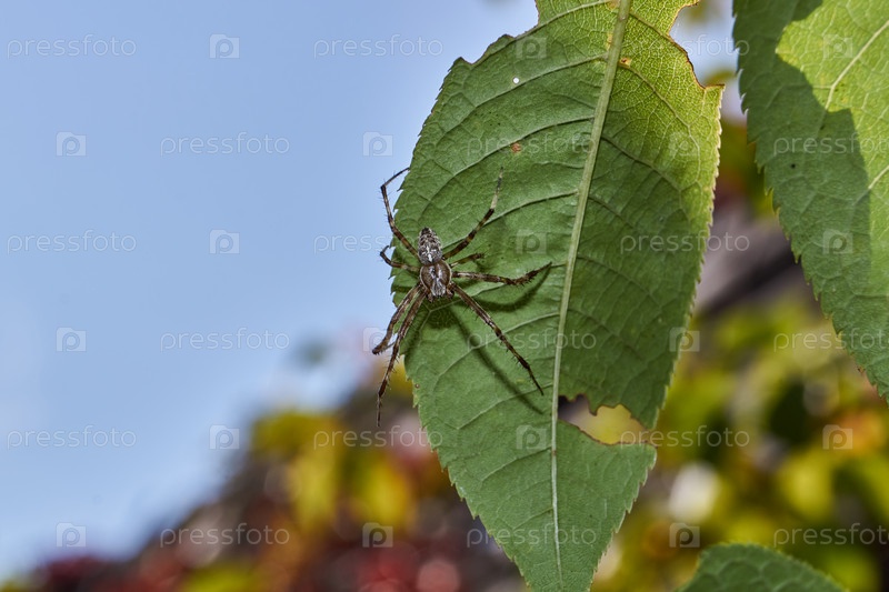 Аранеус на дереве ждет добычи, запутавшейся в паутине