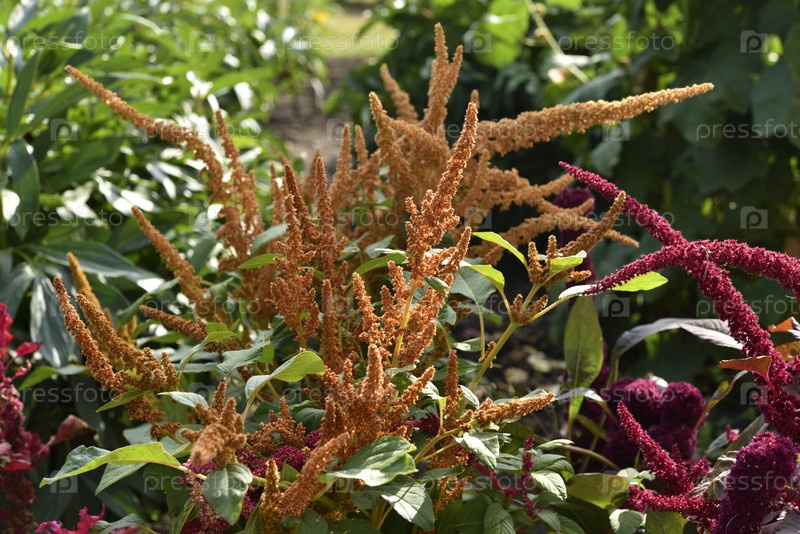 Красные цветы амаранта в летнем зеленом саду. Амарант. Летние цветы
