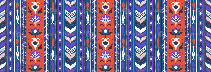 Геометрический дамасский орнамент. Икат границы. Этническая вышивка с листьями и монограммами. Племенная векторная текстура. Бесшовный народный узор в ацтекском стиле. Индийский, скандинавский, цыганский, мексиканский, африканский ковер