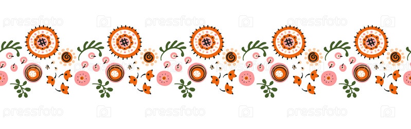 Набор этнических элементов. Бордюр представляет собой полосу с цветами, листьями, ветками, вензелями. Народная вышивка. Славянский, украинский, русский мотив. Хохлома, матрешка, дымковская игрушка. Мексиканский, индийский, цыганский ковер. Вязаное кружево