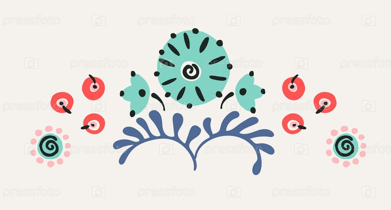 Набор этнических элементов. Бордюр представляет собой полосу с цветами, листьями, ветками, вензелями. Народная вышивка. Славянский, украинский, русский мотив. Хохлома, матрешка, дымковская игрушка. Мексиканский, индийский, цыганский ковер. Вязаное кружево