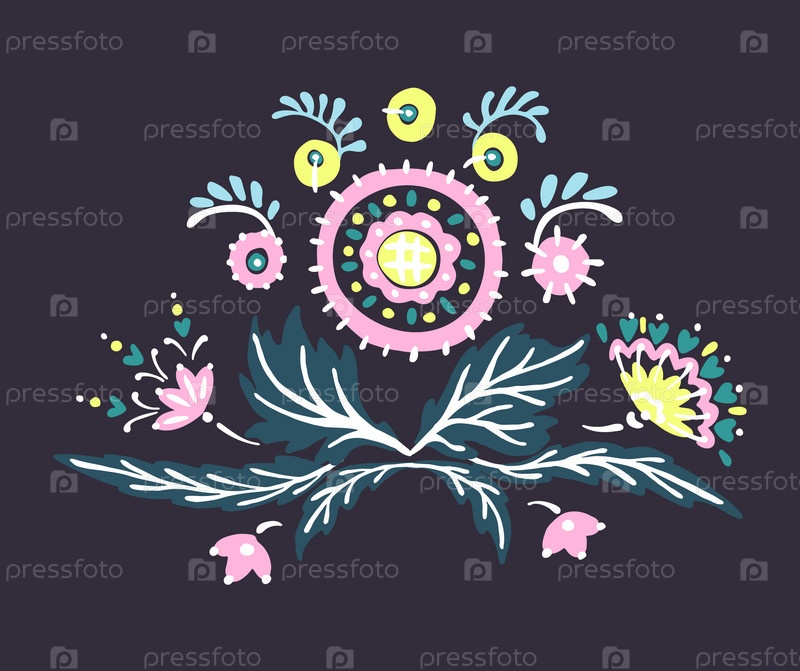 Набор этнических элементов. Бордюр представляет собой полосу с цветами, листьями, ветками, вензелями. Народная вышивка. Славянский, украинский, русский мотив. Хохлома, матрешка, дымковская игрушка. Мексиканский, индийский, цыганский ковер. Вязаное кружево