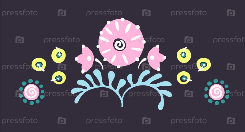 Набор этнических элементов. Бордюр представляет собой полосу с цветами, листьями, ветками, вензелями. Народная вышивка. Славянский, украинский, русский мотив. Хохлома, матрешка, дымковская игрушка. Мексиканский, индийский, цыганский ковер. Вязаное кружево