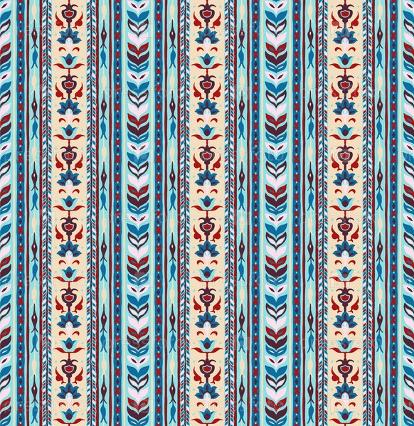 Геометрический дамасский орнамент. Икат границы. Этническая вышивка с листьями и монограммами. Племенная векторная текстура. Бесшовный народный узор в ацтекском стиле. Индийский, скандинавский, цыганский, мексиканский, африканский ковер