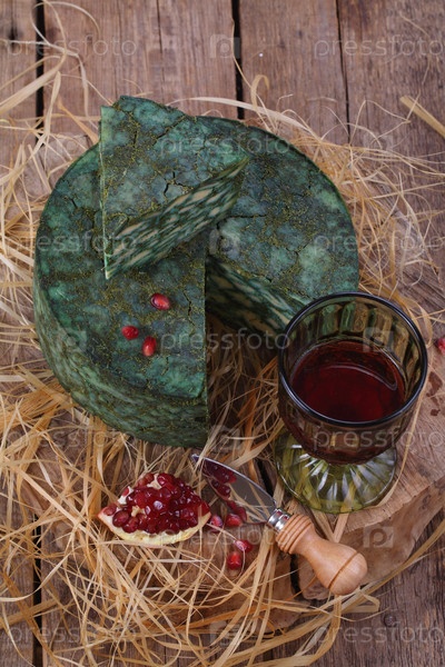 Сыр дерби с шалфеем на деревянном фоне