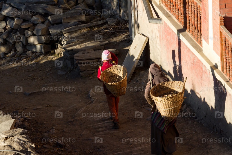 Непальские женщины несут на спине корзины для груза по улице в деревне в Непале