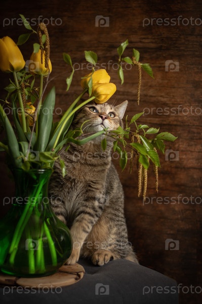 Кошка и тюльпаны
