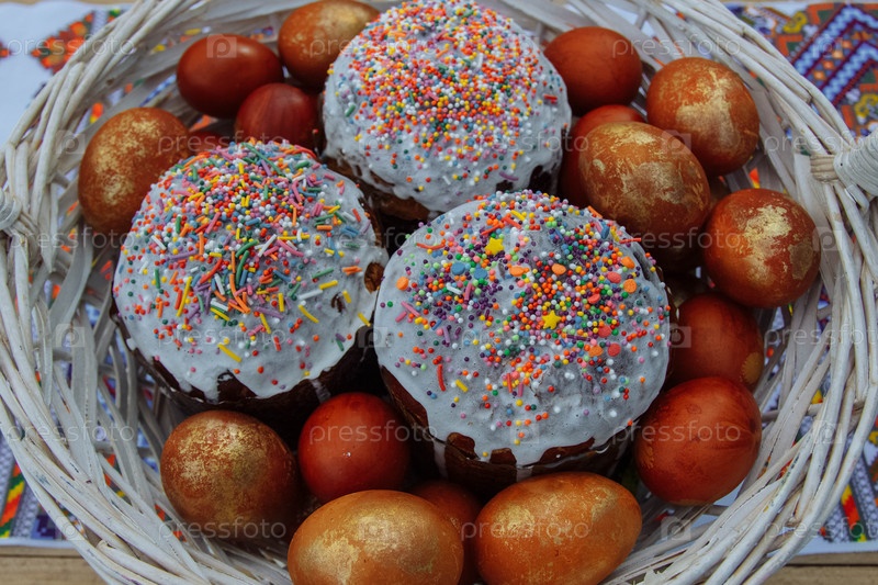 Коржи, покрытые белой глазурью и украшенные посыпкой с расписными коричневыми и золотыми яйцами в белой, плетеной корзине на полотенце с цветным узором