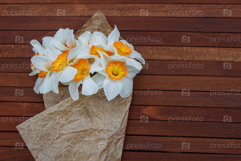 Букет белых и желтых нарциссов в бумажном пакете на коричневом деревянном фоне с пустым пространством для текста, копировальным пространством, плоской планировкой, видом сверху, в пергаментной крафт-бумаге