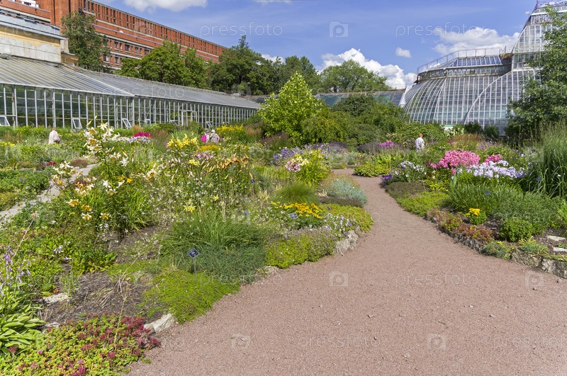 Большой цветник перед оранжереями в ботаническом саду. Санкт-Петербург, Россия. Солнечный день в августе