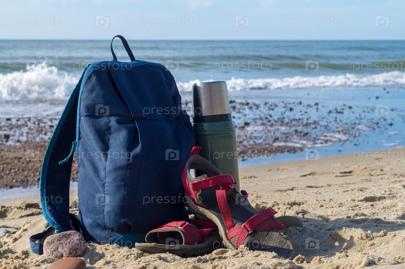 Термос с чаем и рюкзак на фоне природы. Прогулка по берегу моря