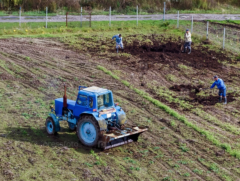 Сельскохозяйственные работы на полях. Синий трактор вспахивает землю. Удобрение почвы