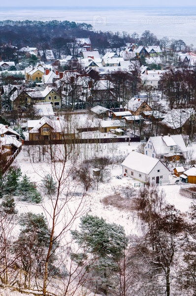 Природный парк-заповедник. Прибрежный поселок, одноэтажные дома. Вид сверху