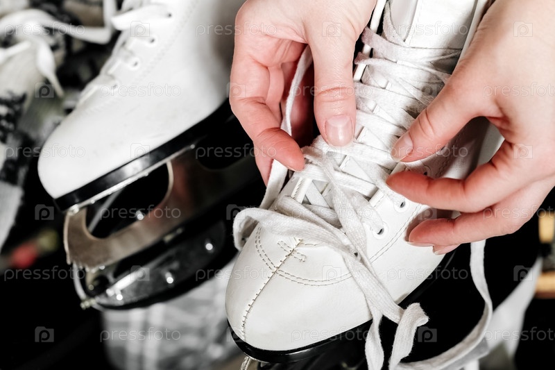 Крупным планом женщина завязывает шнурки на белых ботинках для катания на коньках
