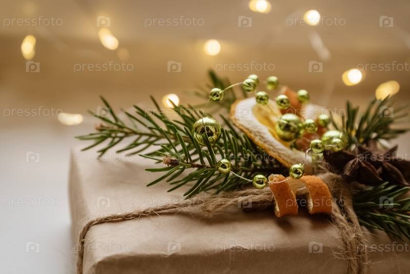 Рождественская подарочная коробка, украшенная свежими еловыми ветками, сушеными апельсиновыми дольками и кожурой и анисовыми звездочками