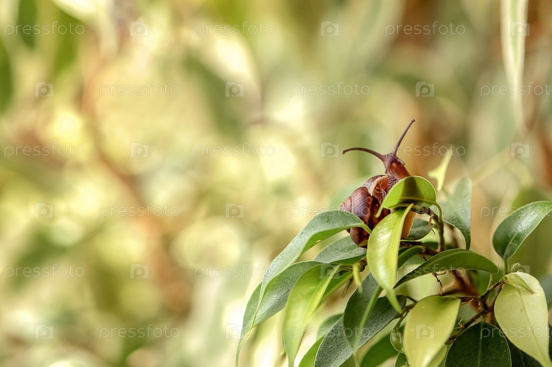 Маленькая улитка ползает среди зеленых листьев