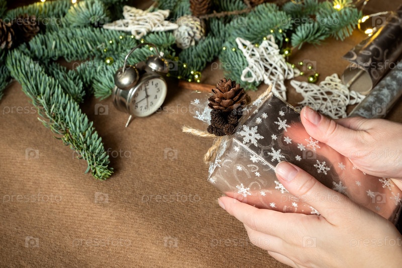 Женские руки прекрасно держат обернутую в бумагу подарочную коробку, украшенную шишками и снежинками. Процесс упаковки новогодних подарков