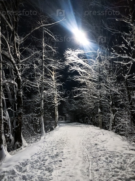 Снежная дорожка между рядами заснеженных деревьев, освещенная светом фонарей