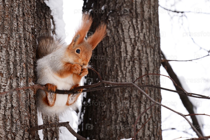 Милая белка ест орехи в зимнем парке, сидя на ветке дерева