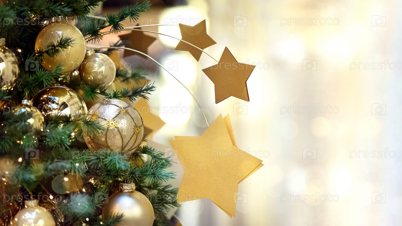 Поздравительная открытка с рождественской елкой, украшенной золотыми шарами и безделушками звезд